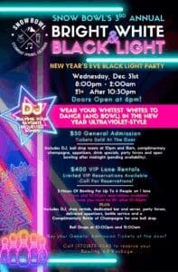 Head to Snow Bowl for the most exciting New Year's Party in town! This is the third annual BLACK LIGHT PARTY: this year's theme is "Bright White and Black Light." Wear your brightest whites under the black lights, and dance to your favorite DJ requested songs! General admission is $30 at the door, and includes dancing to the DJ, ball drop toasts at 10pm and 12am, complimentary champagne, appetizers, drink specials, party favors and open bowling after midnight (pending availability). Want the VIP experience? Upgrade your ticket and reserve your VIP Luxury Bowling Lane for $400, where you and 5 of your friends can enjoy 2 hours of bowling, free shoes and appetizers, a dedicated bar and server, party favors, delivered appetizers, bottle service, and a complimentary bottle of Champagne for one ball drop!